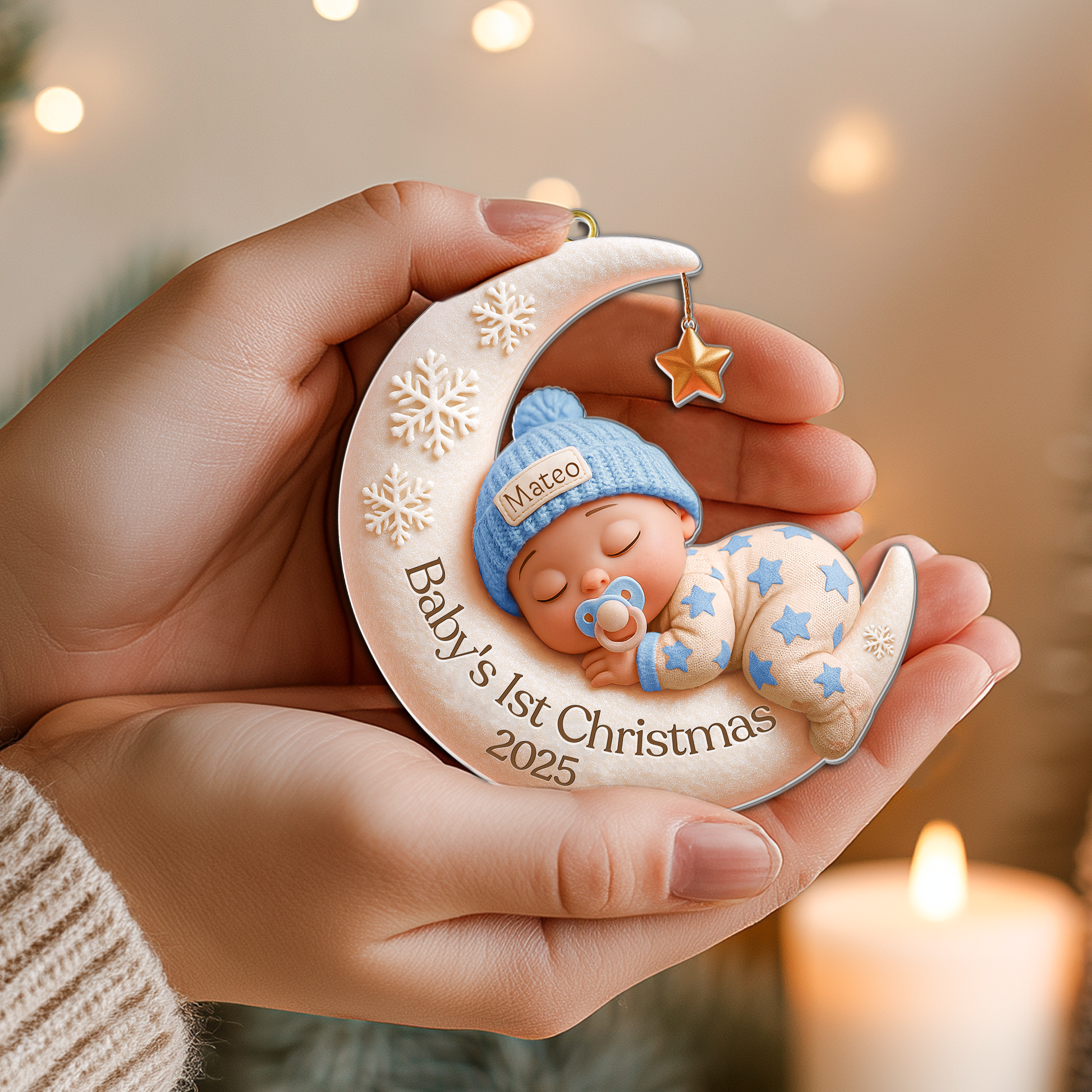 Create a magical memory for your little one’s first Christmas! This 3D acrylic ornament features a sweet baby sleeping on a crescent moon with stunning details and reflective effects. A timeless keepsake you can personalize with your baby’s name and the year, making the holiday season truly unforgettable.