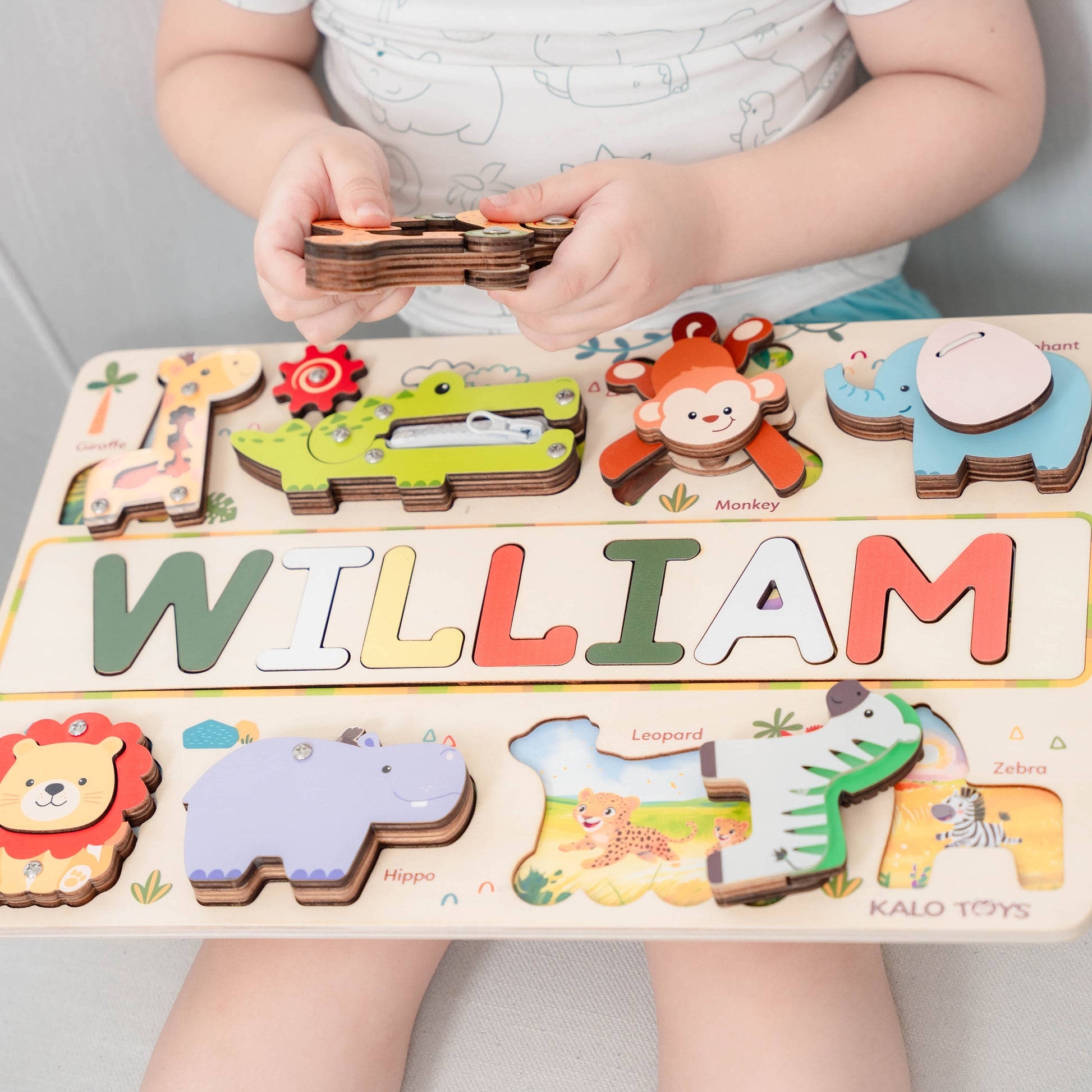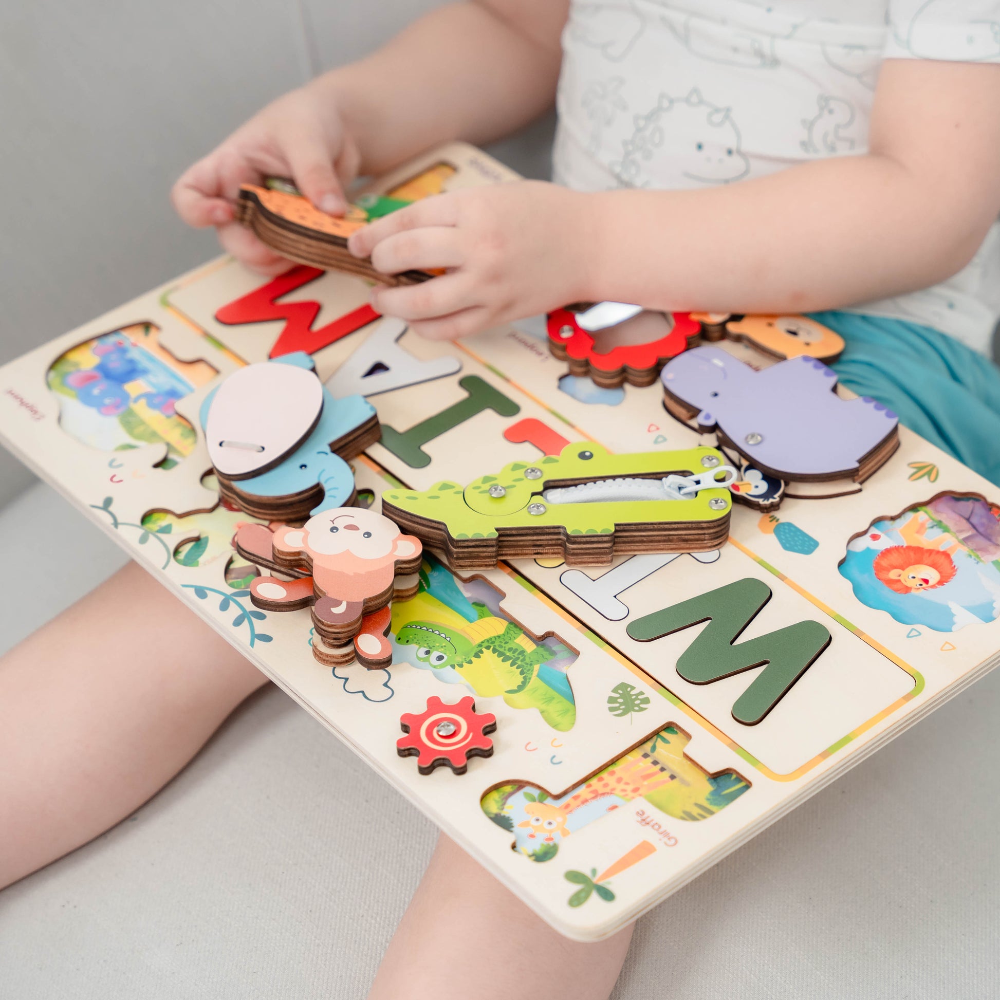 Personalized Safari Name Puzzle Busy Board, Montessori Wooden Toys - Made in USA - Fast shipping NP58