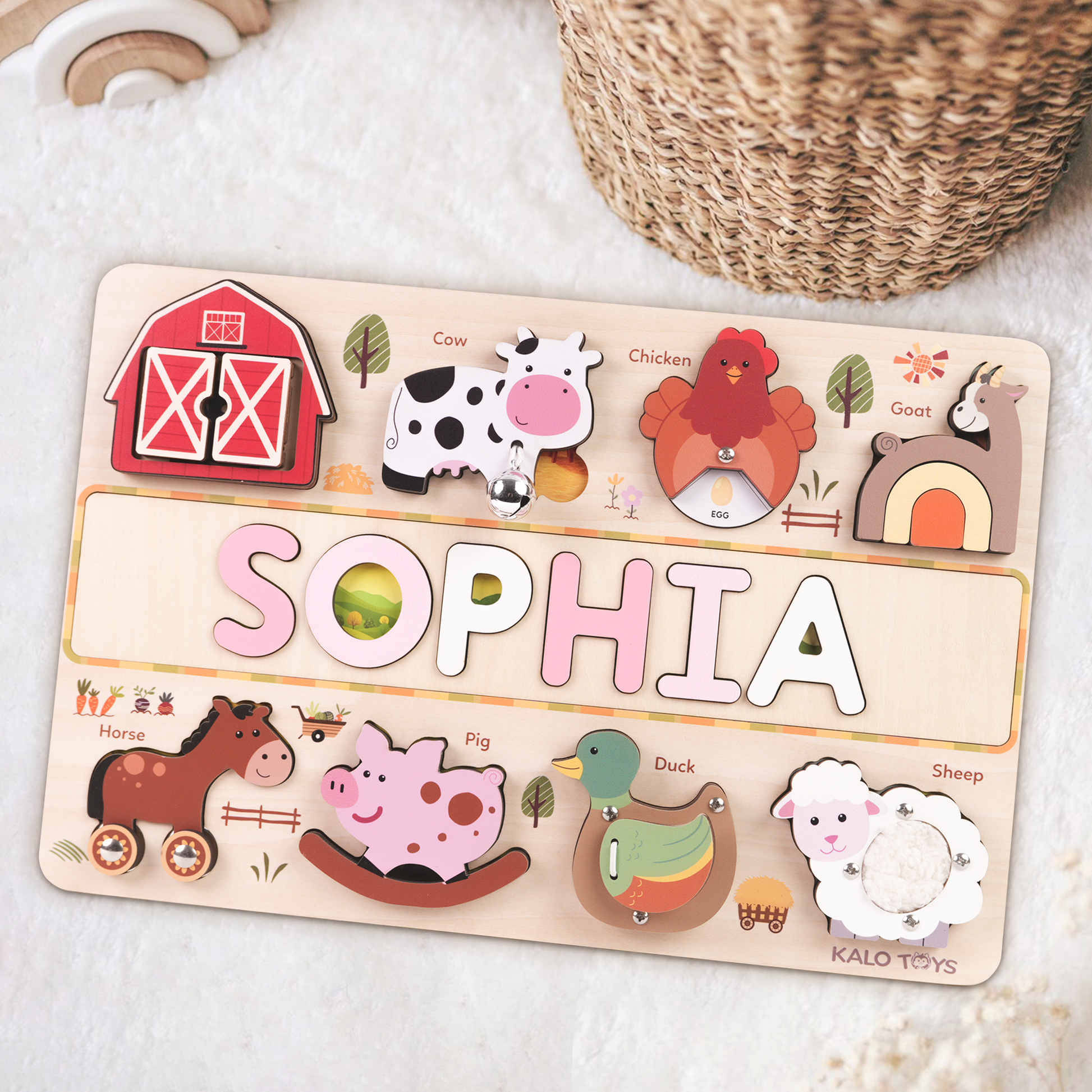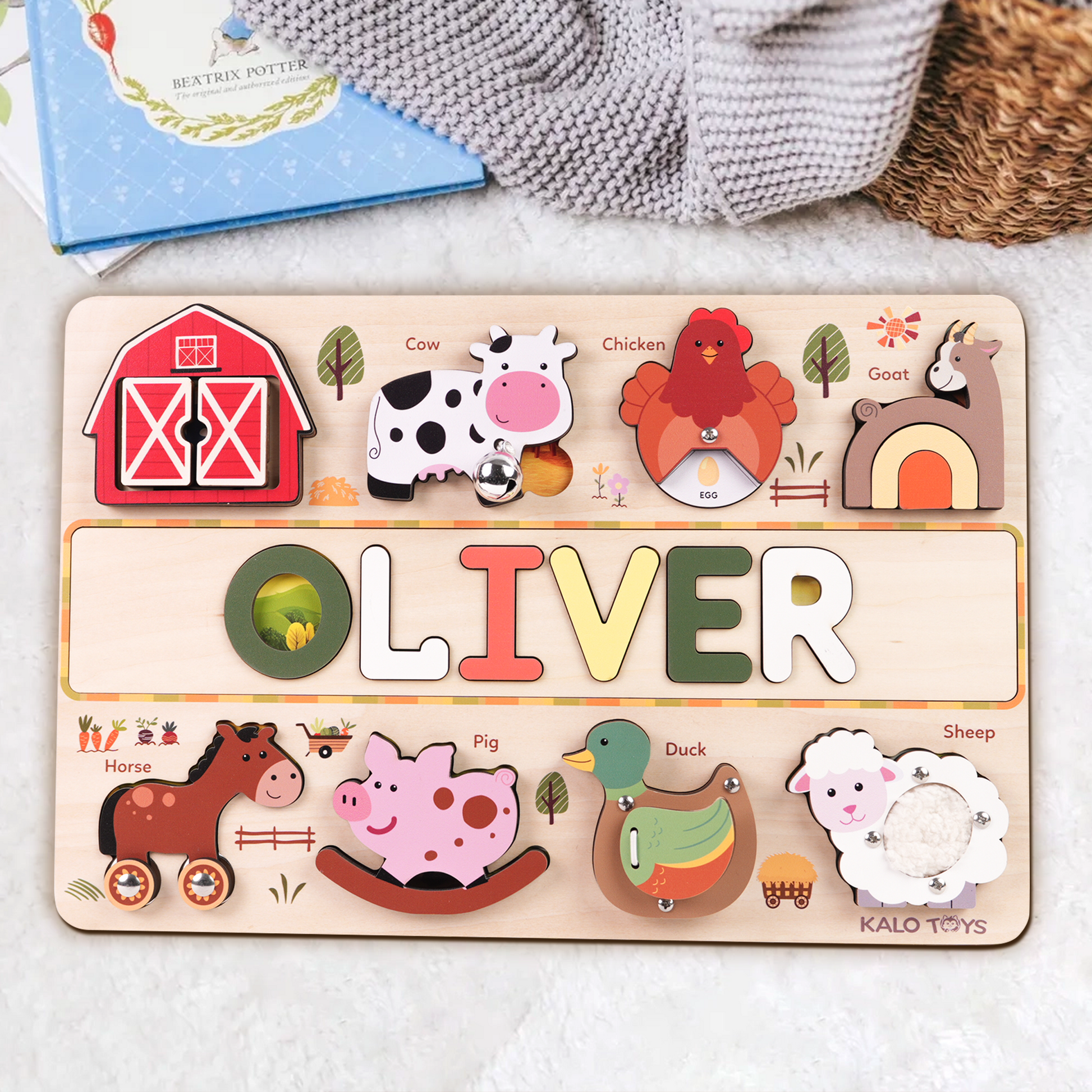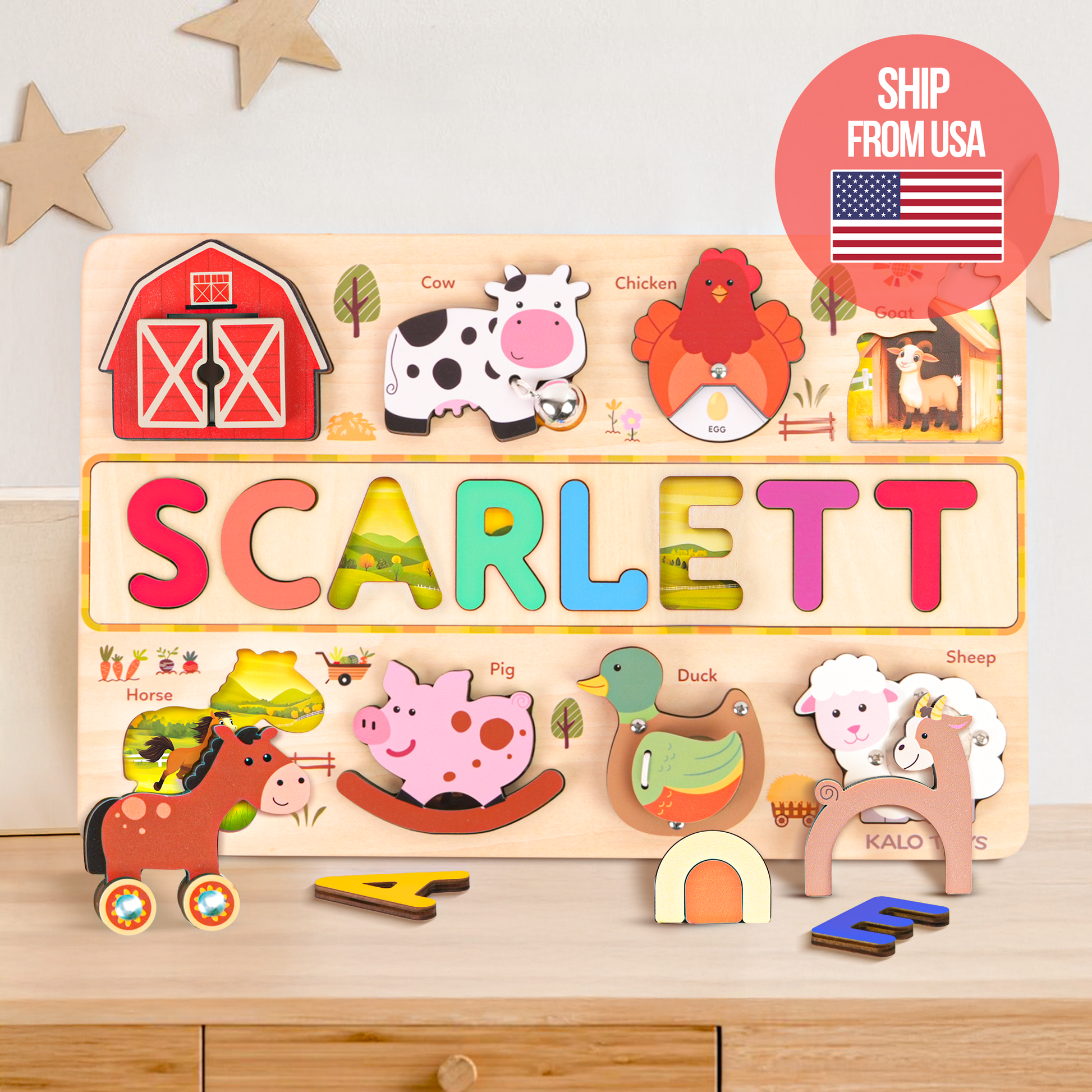 Personalized Wooden Name Puzzle – Farm Animal Sensory Toy Made in USA