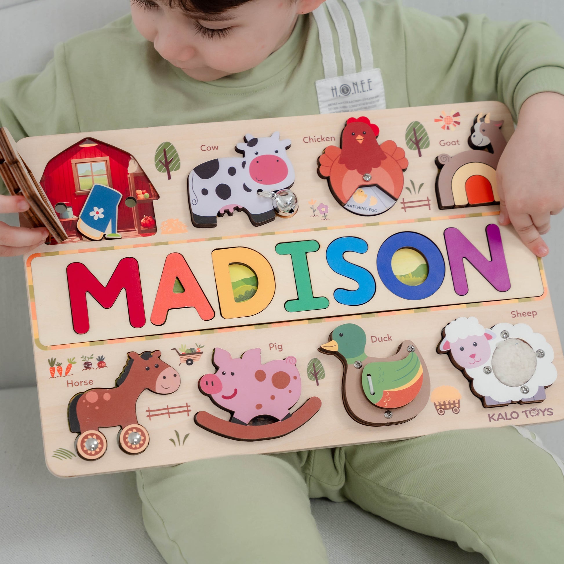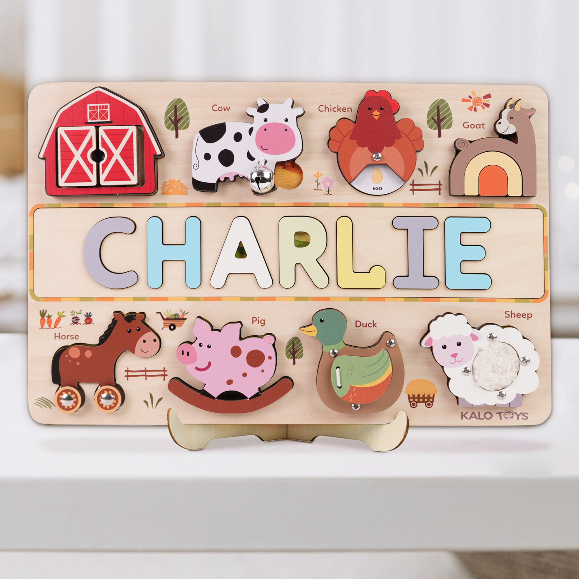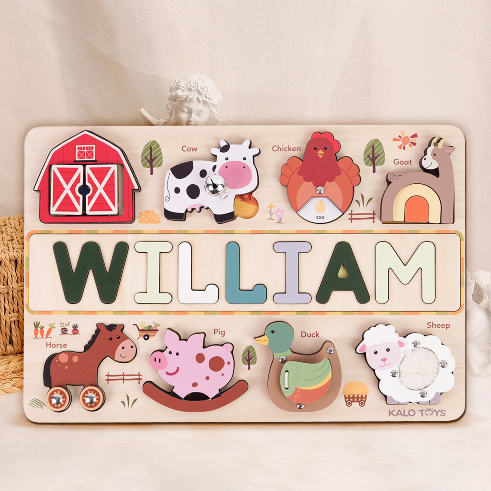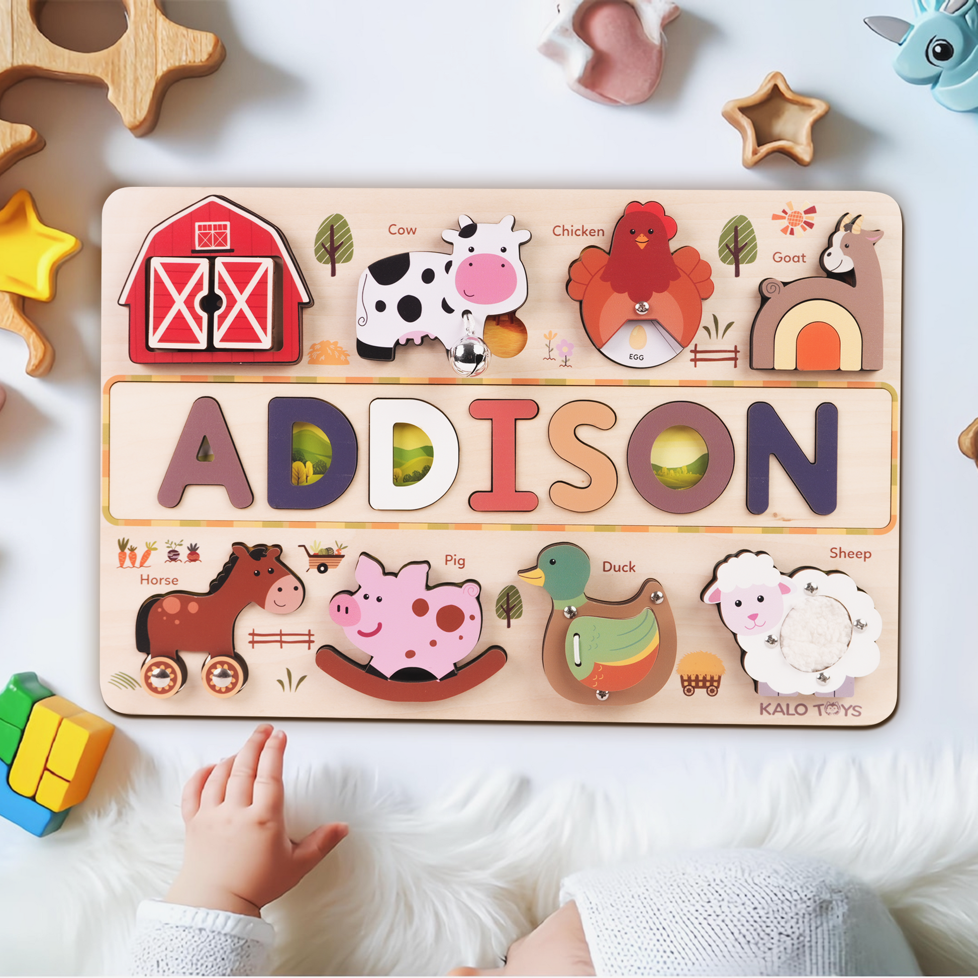 Personalized Wooden Name Puzzle – Farm Animal Sensory Toy Made in USA